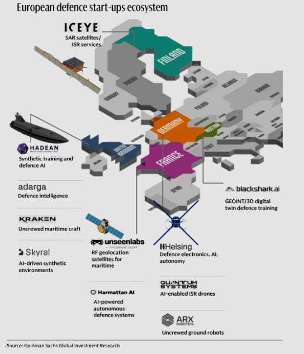 According to Goldman Sachs, Europe hosts over 380 defence tech startups that have raised more than $3 billion, clustered in hubs like London, Munich and Stockholm.